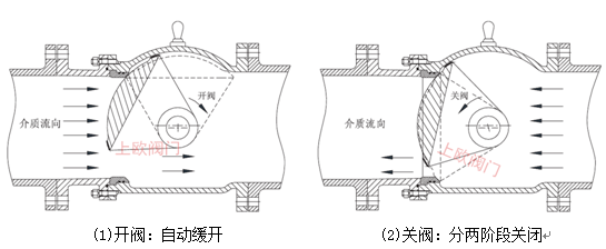 液控緩閉止回閥是目前國內外較為先進的水泵出口控制設備,可安裝于水電站水輪機進口,作為水輪機進口控制閥;也可安裝于各類水泵出口,替代止回閥、閘閥和水捶消除器。工作時,閥門與管道主機匹配,按照水力過渡過程原理,通過預先設置的啟閉程序,有效消除管網水錘,實現管網的可靠運行,起到保護管網與泵閥設備安全的作用。然而蝶式閥門由于其閥板處于流道中央,無法避免介質對閥板、閥軸以及閥座密封面的沖刷,同時閥板對介質流通產生阻礙而容易產生渣質的堆積與密封的實效,故不能適應含渣、含雜質的工況。