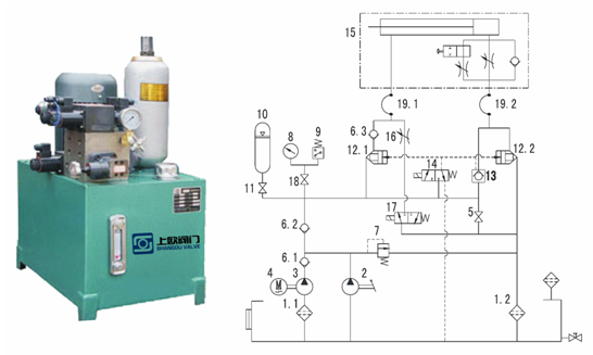1、濾油器2、手壓油泵3、柱塞泵4、電機5、截止閥6、單向閥7、溢流閥 8、壓力表9、壓力控制器10、蓄能器11、截止閥12插裝閥13、液控單向閥 14、電磁換向閥15、三調節液壓缸16、節流閥17、電磁換向閥18、截止閥 19、高壓軟管