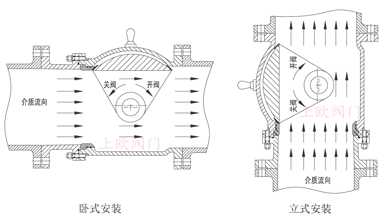 3、不積渣、零水損:如下圖所示,閥門采用全流道設計,當閥門全開時,半球形閥芯處于流道一側,不占用流道空間阻礙流體的通過,特別適合含渣量高與流速高的"雙高"介質;