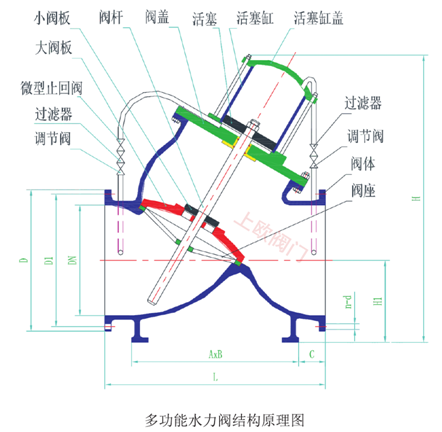 由主閥和外控組件構(gòu)成。主閥由閥體、大小閥板、閥桿、閥蓋、閥座及活塞、活塞缸等構(gòu)成,外控組件由微止回閥、調(diào)節(jié)閥、過(guò)濾器及相應(yīng)管路構(gòu)成。外控組件中一路連通閥進(jìn)口端與活塞缸下腔,另一路連通閥出口端與活塞缸上腔