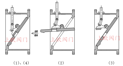 2、關閥:停泵瞬間,閥門進口流量及壓力突然降低,大閥板在重力作用下迅速關閉(閥板與閥座接觸前,設有緩沖機構,保護密封面),截斷大部分水流,小閥板在控制腔作用下自動開啟泄除回流壓力水,削減水錘峰值,如圖(3)示;同時,一部分回流水通過旁通管道進入控制腔上腔,推動控制桿下行,關閉小閥板至完全切斷介質,如圖(4):示。關閥時間可通過旁通管道上的調節(jié)閥調節(jié),使水錘峰值在控制范圍內。