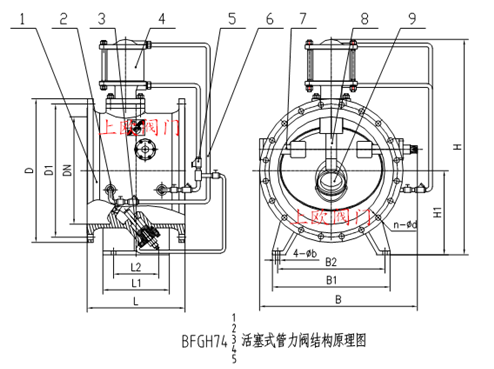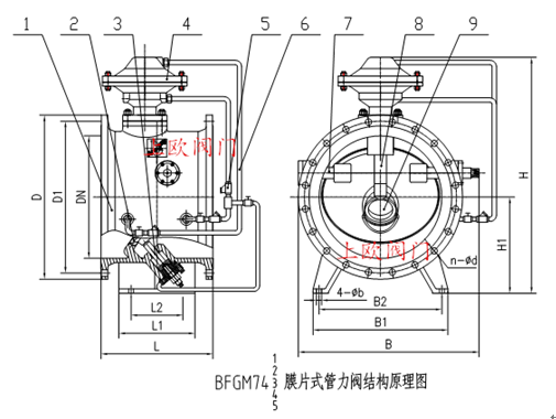 2、BFDG7h42調節(jié)型(A手動、B電動) 在普通型基礎上,通過在控制腔上安裝調節(jié)裝置,可以根據(jù)系統(tǒng)要求采用手動或者電動調節(jié)閥門開度,以達到對管網(wǎng)內介質流量的粗量調節(jié)與控制。電裝常規(guī)供貨為普通型,有特殊要求,可按用戶要求配置。