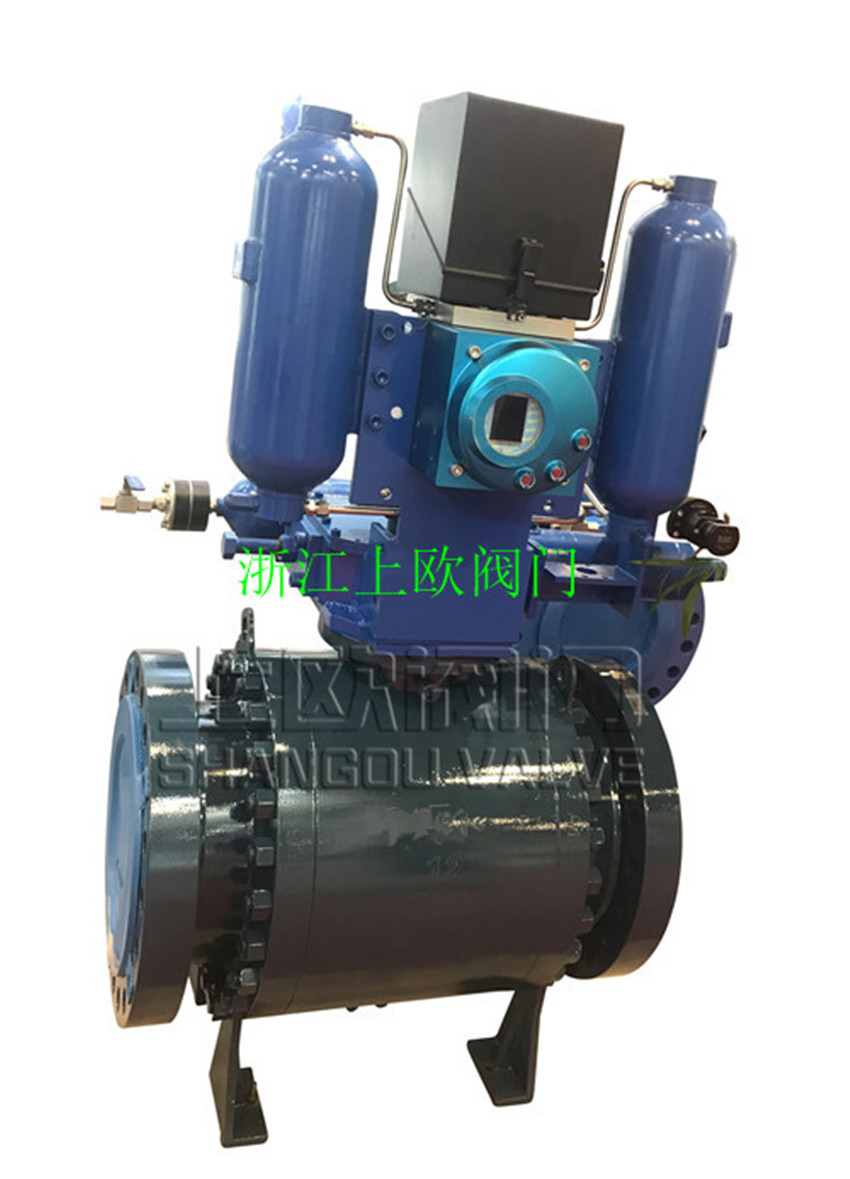 上歐閥門生產(chǎn)的氣液聯(lián)動球閥由氣液聯(lián)動執(zhí)行器和高壓球閥組成。氣液聯(lián)動執(zhí)行機(jī)構(gòu)的動力源直接取自主管線的高壓天然氣,天然氣經(jīng)過濾之后,直接進(jìn)入儲氣罐儲存。采用集成模塊、大流量、高壓設(shè)計技術(shù),使較少的控制元件承受高壓,延長密封件的壽命、減少配管、減少系統(tǒng)泄漏點(diǎn)從而提高了設(shè)備的整體安全性。 液壓系統(tǒng)具有傳動剛性強(qiáng)、不易壓縮、傳動平穩(wěn)、易于密封等優(yōu)點(diǎn)。氣體具有壓縮比大的優(yōu)點(diǎn)。氣液聯(lián)動執(zhí)行機(jī)構(gòu)通過氣液傳動方式的轉(zhuǎn)換,將氣、液二者優(yōu)點(diǎn)得到完美結(jié)合。高壓氣體經(jīng)過控制系統(tǒng)進(jìn)入氣液罐轉(zhuǎn)換,罐體內(nèi)等壓的液壓油被壓入相應(yīng)的液壓活塞缸,同時液壓活塞缸液壓油流回到另一個氣液罐內(nèi),活塞動作帶動執(zhí)行機(jī)構(gòu)驅(qū)動閥門實現(xiàn)平穩(wěn)的開或關(guān)。 氣液聯(lián)動執(zhí)行機(jī)構(gòu)工作性能穩(wěn)定、動作可靠。通過調(diào)節(jié)液壓油的流量可調(diào)節(jié)執(zhí)行機(jī)構(gòu)動作的全行程時間。